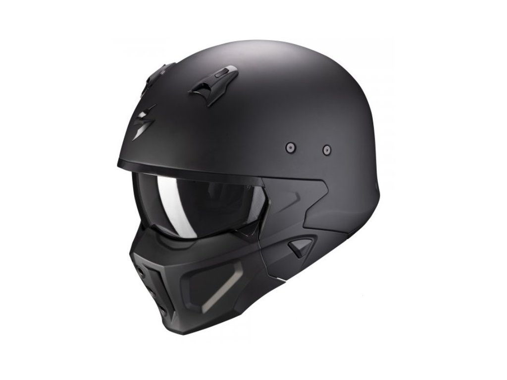 SCORPION COVERT-X motoros sisak, tömör fekete, matt, a héj TCT anyagból készült (Tri Composit Technology), amely nagyon tartós, könnyű, lehetővé teszi a csontváz fokozatos deformálódását és az energiaelnyelést ütközéskor. Kivehető állrésszel rendelkezik. A KwickWick2 belseje hipoallergén, megszabadítja az izzadságot arcról és fejről, nagyon kényelmes, teljesen kivehető és mosható. A csomag tartalmaz egy sötét füstös, egy világos füstös és egy belső összecsukható paravánt, átlátszó, tükör arany vagy ezüst paraván vásárlási lehetőséggel. A rögzítést mikrometrikus csat biztosítja. A sisakon a két felső szellőző, az állszellőző és az állterelő dominál, ami a csomagban található. ECE-tanúsítvány 22.05.