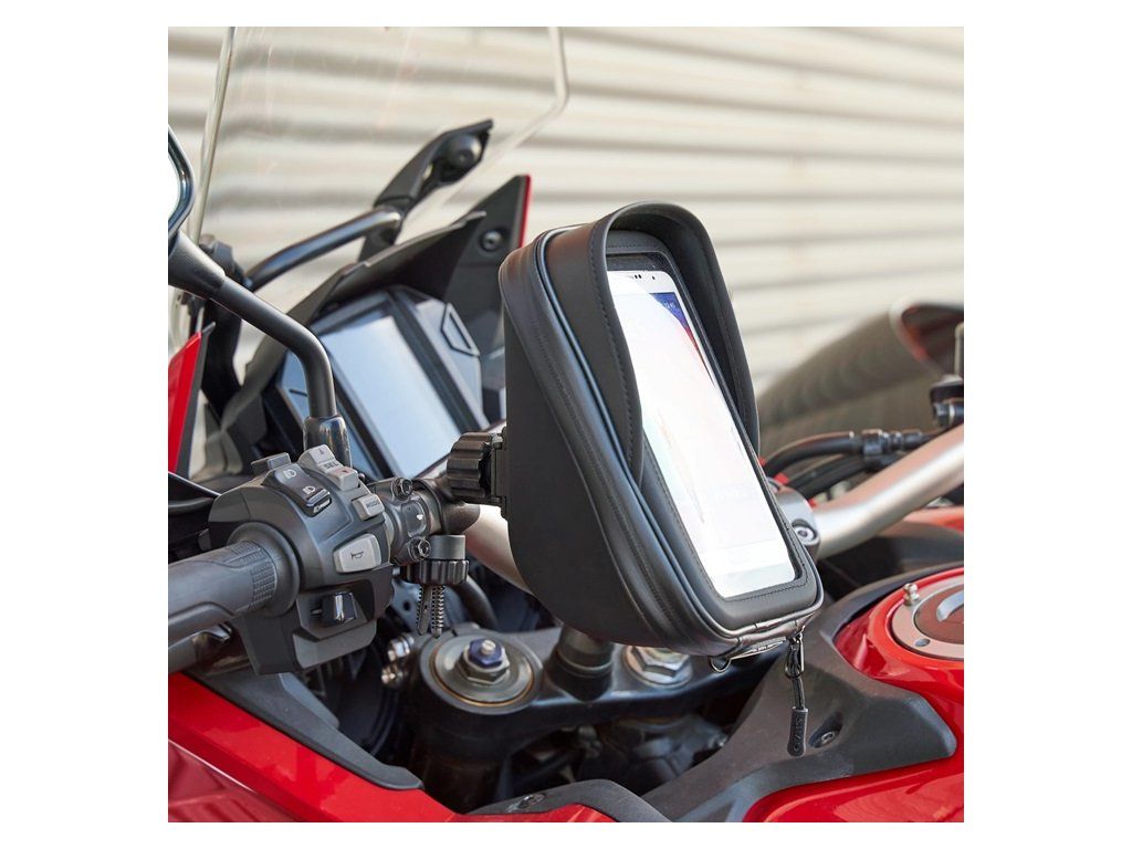 Okostelefon-tartó, amely minden motorkerékpárral kompatibilis. Gyors és egyszerű rögzítés a kormányra az univerzális rögzítőrendszernek köszönhetően, akár kesztyűben is állítható. Tükröződésmentes napellenző, megerősített kábelkivezető nyílás és belső párnák különböző telefonméretekhez. Biztonsági pánt mellékelve. Más járművekkel is kompatibilis, például quadokkal, kerékpárokkal vagy robogókkal.Kiegészítő paraméterek