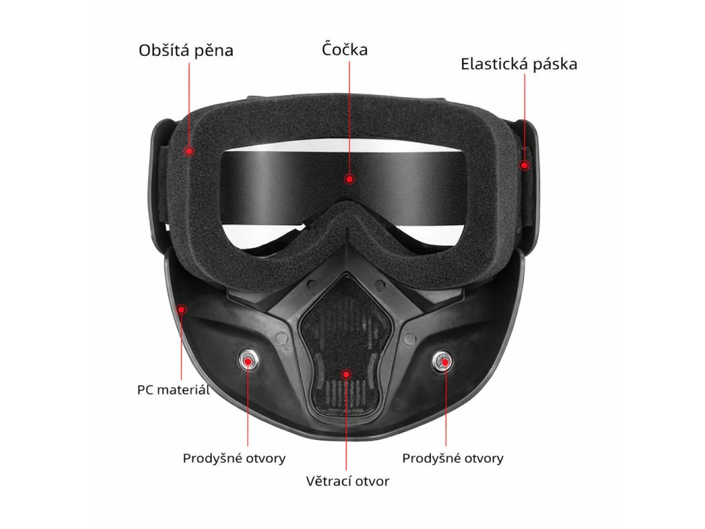 A kialakítás teljes körű szem- és orrvédelmet biztosít, valamint véd a szél, a por, a rovarok és az UV-sugarak ellen. Az integrált szélálló maszk megkönnyíti a légzést és minimalizálja a lencse bepárásodását, így alkalmassá teszi a gyors motorozásra még nehéz időjárási körülmények között is.