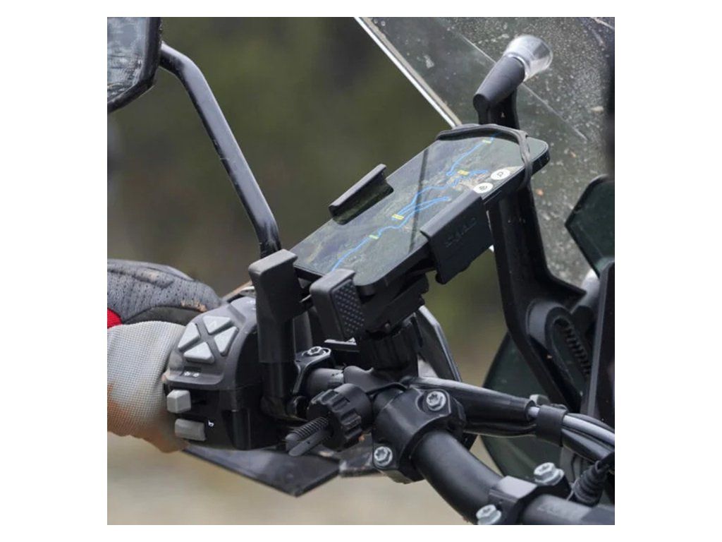 A SHAD X-frame telefontartó nagyszerű kiegészítő minden motoros számára, aki szeretné, hogy telefonja könnyen elérhető legyen vezetés közben. A tartó univerzális kialakításának köszönhetően minden típusú motorkerékpáron használható. A tartó lehetővé teszi 135x65 mm-től 180x90 mm-ig terjedő méretű telefonok rögzítését. A tartó lehetővé teszi függőleges vagy vízszintes felszerelést - navigációs rendszerként való használathoz. A tartó felhelyezése vagy eltávolítása nagyon egyszerű az univerzális, mechanikus zárral ellátott SHAD Quick Click System rendszernek köszönhetően, amely lehetővé teszi a tartó felső részének és a telefon gyors rögzítését és eltávolítását. A tartó nagy vezérlőfelületekkel rendelkezik, így kesztyűben is kezelhető. A telefon biztonságát gumi markolatok biztosítják, amelyek körülölelik a készüléket és megakadályozzák a kicsúszását, a telefon biztonságát pedig egy gumi zár is növeli, amellyel rögzítheti a telefont a kicsúszás ellen. A telefon biztonságát tovább növeli a kormányhoz rögzítő pánt, így még ha... A tartó két változatban kapható – kormányrögzítővel (X0SG00H) vagy tükör alá szerelhető tartóval (X0SG00M). A tükör alá szerelhető változat esetében két adapter található M8 és M10 anyákhoz, a motorkerékpár típusától függően. Nagy szilárdságú poliamidból készült üvegszállal. Shad Quick Click rendszer kesztyűben használható. X-Frame rendszer a telefon egyszerű behelyezéséhez és eltávolításához. A telefon többszörös rögzítése a kiesés ellen. Lehetőség van 20-40 mm átmérőjű kormányra való rögzítésre (X0SG00H). Lehetőség van M8 vagy M10 átmérőjű tükör alá szerelésre (X0SG00M). Minden kezelőszerv kesztyűben is állítható. A gömbcsapnak köszönhetően teljes mértékben beállítható a dőlésszög és az elforgatás.Kiegészítő paraméterek